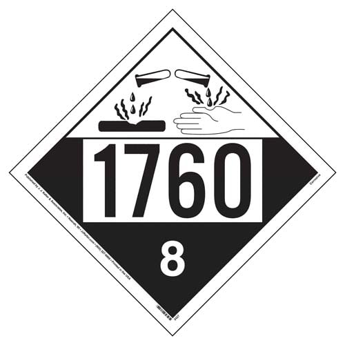 (Part # 16099) Corrosive placards display UN 1760, hazard class 8, and meet hazmat placarding requirements.