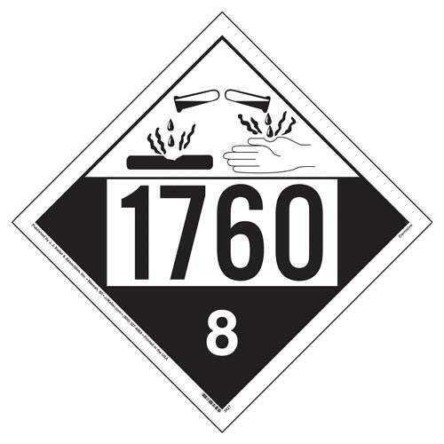 (Part # 50935) Corrosive placards display UN 1760, hazard class 8, and meet hazmat placarding requirements.
