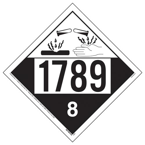 (Part # 50169) Corrosive placards display UN 1789, hazard class 8, and meet hazmat placarding requirements.