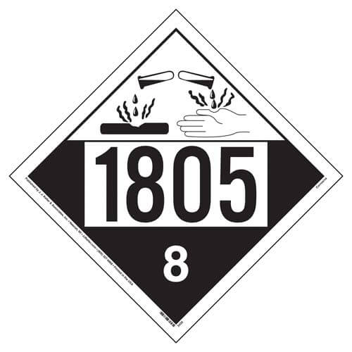(Part # 3440) Corrosive placards display UN 1805, hazard class 8, and meet hazmat placarding requirements.