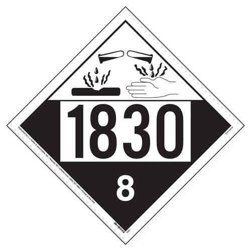 (Part # 3452) Corrosive placards display UN 1830, hazard class 8, and meet hazmat placarding requirements.