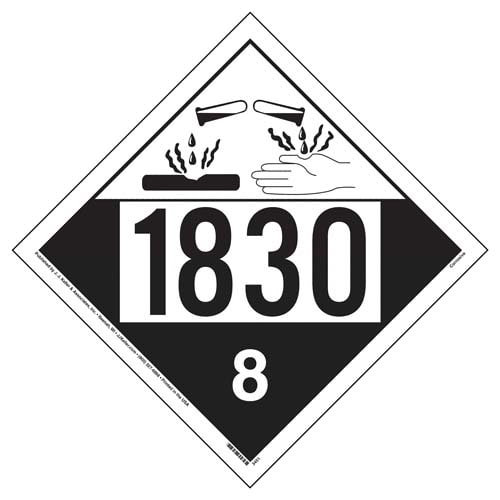 (Part # 36007) Corrosive placards display UN 1830, hazard class 8, and meet hazmat placarding requirements.