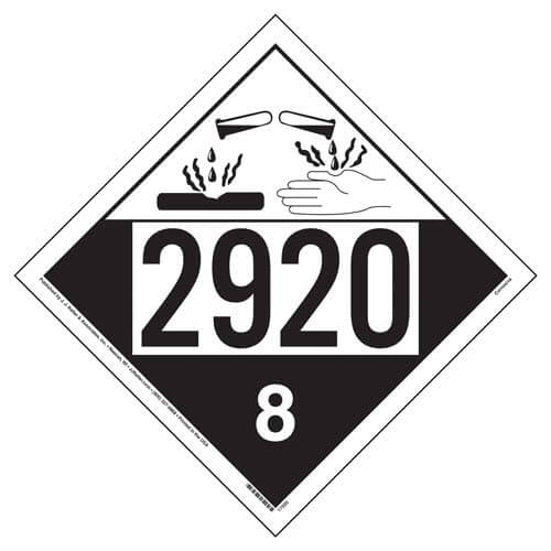 (Part # 17505) Corrosive placards display UN 2920, hazard class 8, and meet hazmat placarding requirements.