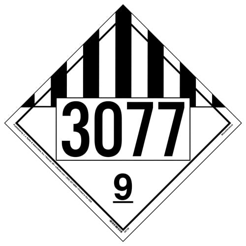 (Part # 58738) Miscellaneous dangerous goods placards display UN 3077, hazard class 9, and meet hazmat placarding requirements.