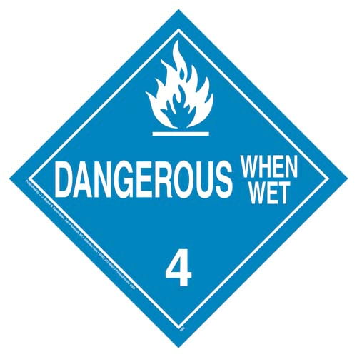 (Part # 39048) Dangerous when wet worded placards display hazard class 4 and meet DOT placarding specifications.