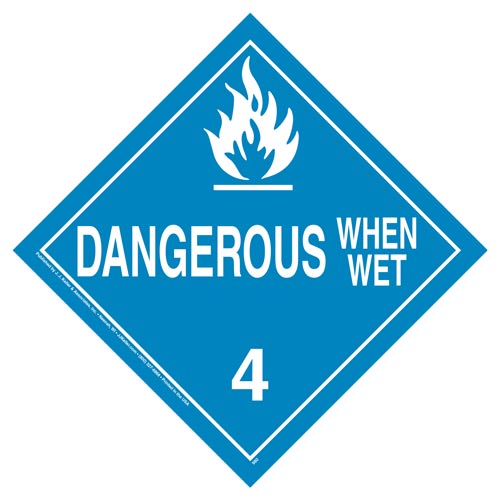 (Part # 50938) Dangerous when wet worded placards display hazard class 4 and meet DOT placarding specifications.